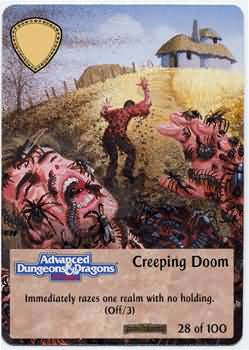 Creeping Doom is not a bad card by any means, but it pales in comparison to other cards that do more. Razing a realm is decent, but placing one in the discard pile or Abyss is so much better. That's why Creeping Doom is overshadowed by Disintegrate, Psionic Disintegration, Estate Transference, and Dissolution. The fact that a holding makes a realm immune to Creeping Doom decreases its worth even more. The biggest indictment of this card I can think of is that I have about 10 decks and Creeping Doom is in none of them. There are just too many better spells.